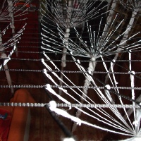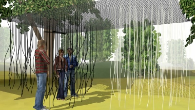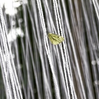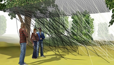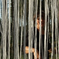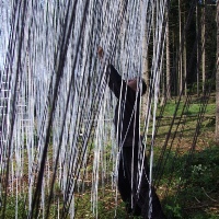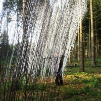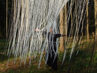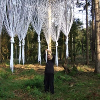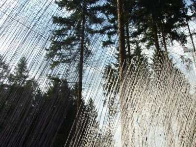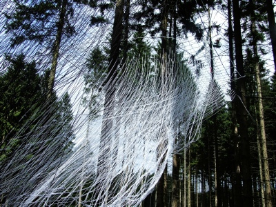 Anke Sauer hat in einer zurückhaltenden Weise mit einfachen Mitteln einen sehr präsenten Raum geschaffen, der artifiziell ist und doch korrespondierend mit der direkten Umgebung. Sie hat den Ort für die technischen Notwendigkeiten genutzt, die Technik der Verspannung tritt jedoch völlig in den Hintergrund und das zarte Material der Fäden kann sich frei bewegen und entfalten. Der durch die weißen und schwarzen Fäden entstandene Raum nimmt selbst den leisesten Windhauch auf und ist in ständiger Bewegung. Es entsteht ein Zwischenraum, ein beständig wechselnder Zwischenzustand, ein bewegter poetischer Raum, der den Betrachter bezaubert und berührt.