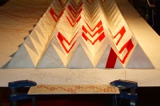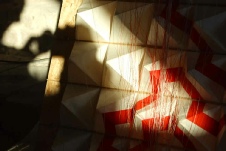 Besteht aus 4 verschiedenen Papiersorten. Der obere Teil ist mit roter Tinte bemalt. Das untere Papier besteht fast nur aus dicken Fasern Der Drachen löst sich nach unten hin auf.