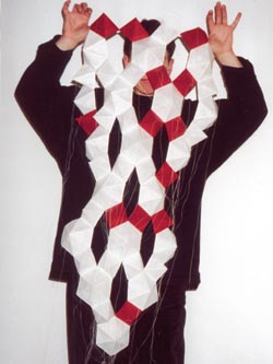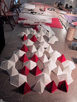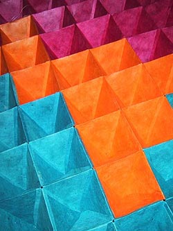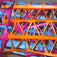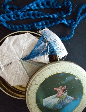 Bestehend aus Nepalpapier blau gefärbt, weißes japanisches Papier gelöchert.