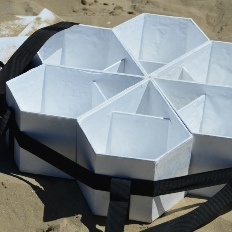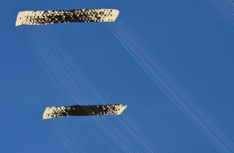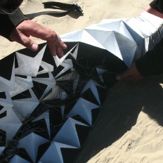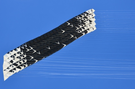 Die stablosen Drachen können durch eine Drehbewegung zu einem kleinen Paket „gerollt“ werden, so das sie in eine dafür hergestellte Transportbox passen.