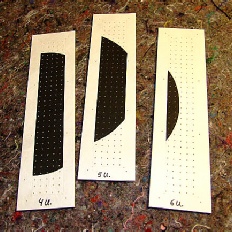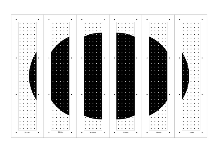 Die Flächen der Drachen zeigen einen schwarzen „zerlaufenden“ Punkt. Die überwiegend schwarz eingefärbten Pyramiden sind mit einer schwarzen Leine versehen und bilden am Ende der Waageleine einen Punkt der scharfkantig ist. Auf den sechs Brettchen wodurch die Schnüre voneinander separiert sind ist dieser schwarze Punkt auch vorhanden.