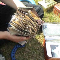 Besteht aus 4 verschiedenen Papiersorten. Der obere Teil ist mit roter Tinte bemalt. Das untere Papier besteht fast nur aus dicken Fasern Der Drachen löst sich nach unten hin auf.